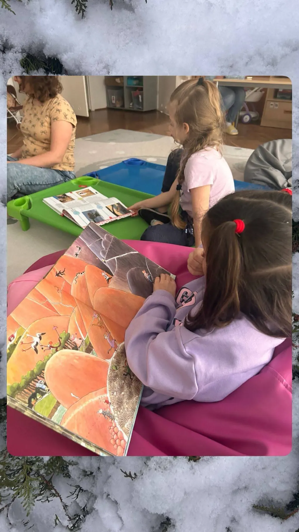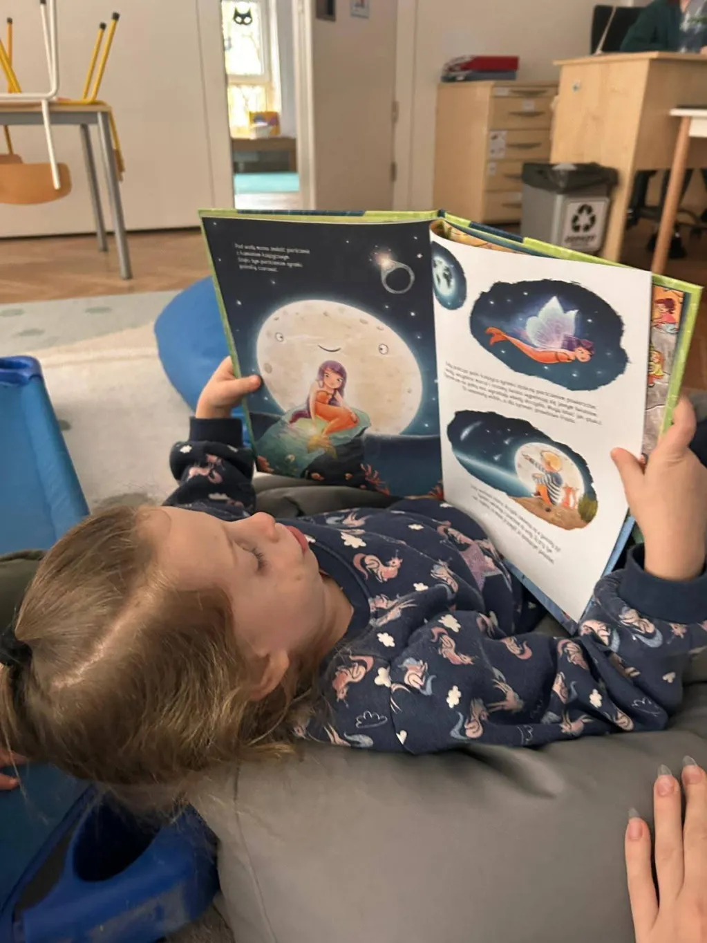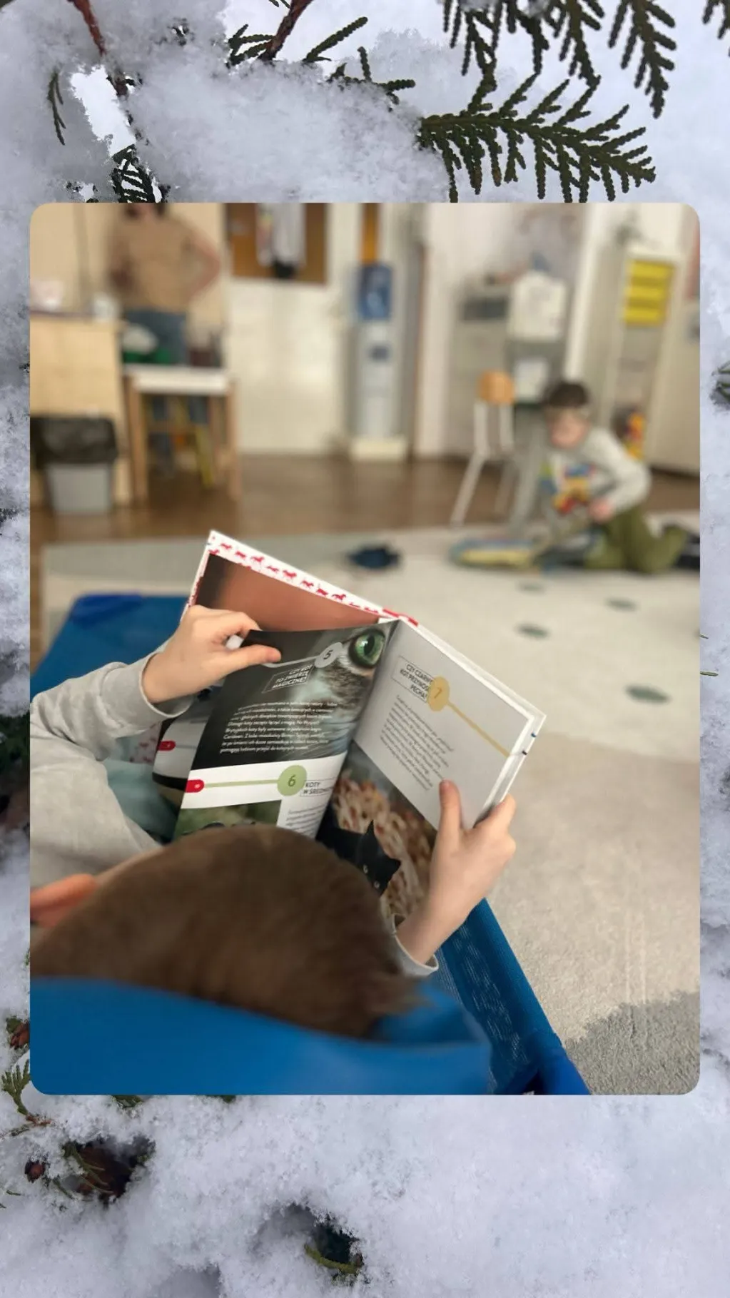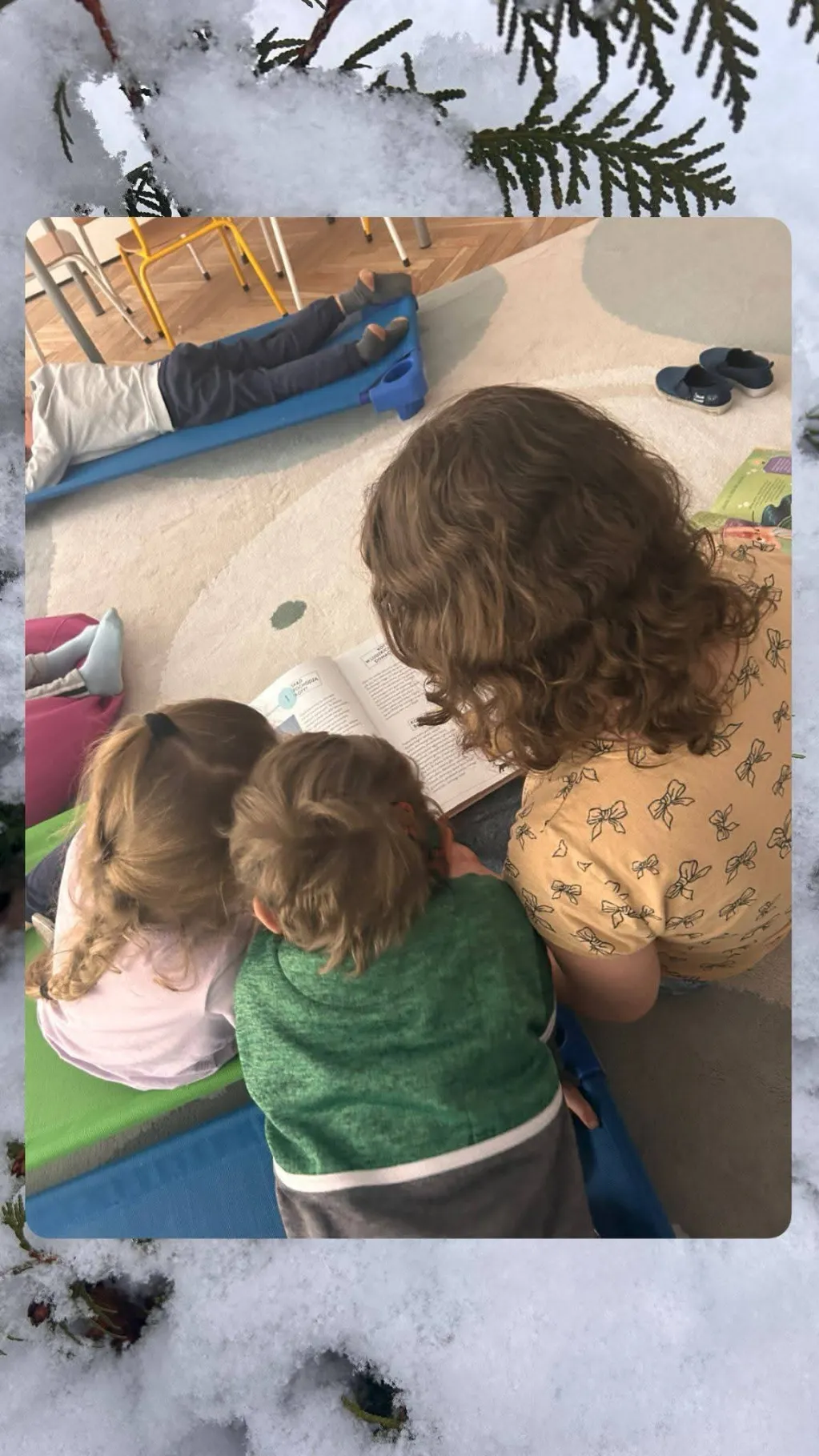 Po obiedzie w naszym przedszkolu przychodzi czas na spokojny odpoczynek i chwilę z książką 📚😌 Czytamy w języku polskim lub migamy w PJM 🤟, a dzieci próbują także samodzielnie „czytać”, bo nie trzeba jeszcze znać liter, aby czerpać radość z pięknie ilustrowanych książek i rozwijać wyobraźnię ✨