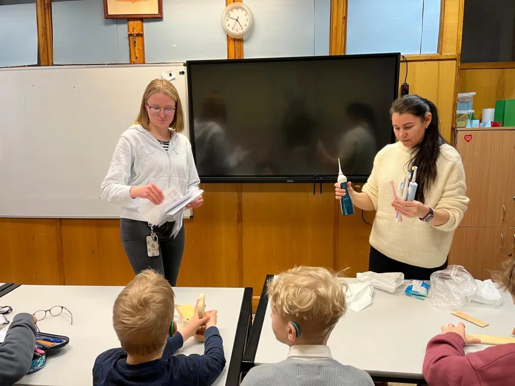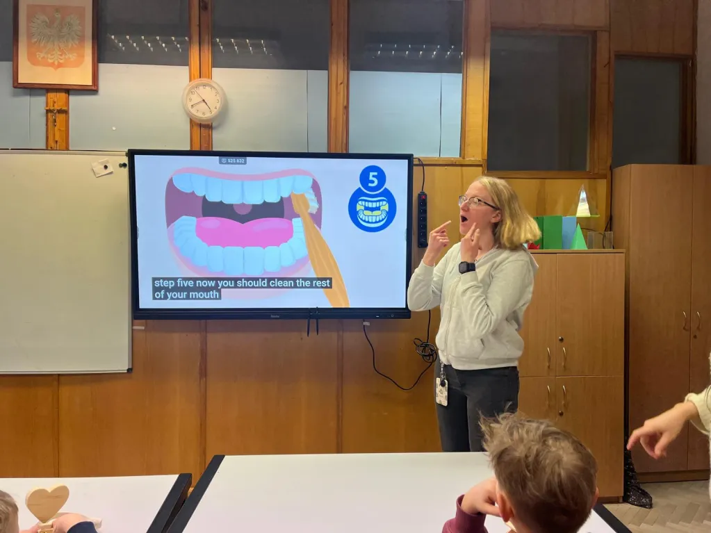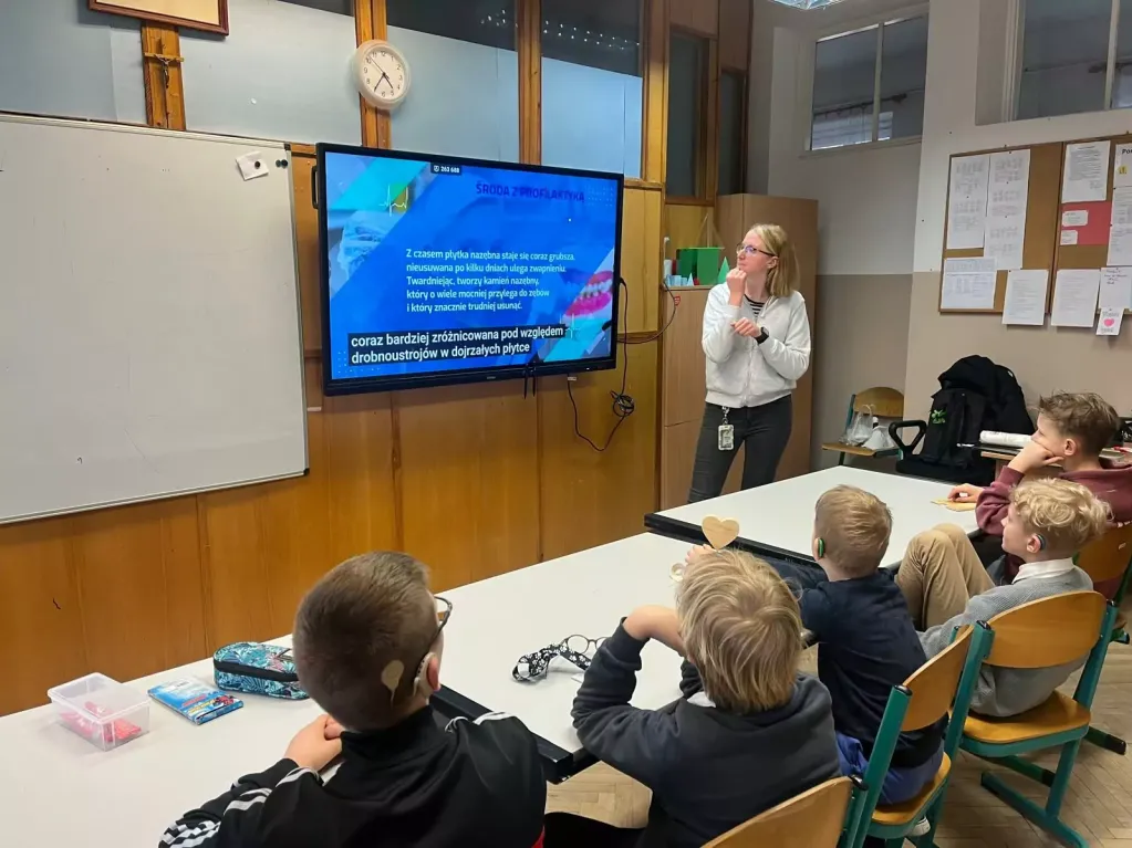Pokazano im różne rodzaje szczoteczek – zarówno manualne, jak i elektryczne – a także urządzenia do płukania ust oraz nici dentystyczne. Na zakończenie zajęć wykonały rysunki przedstawiające zdrowe nawyki higieniczne.