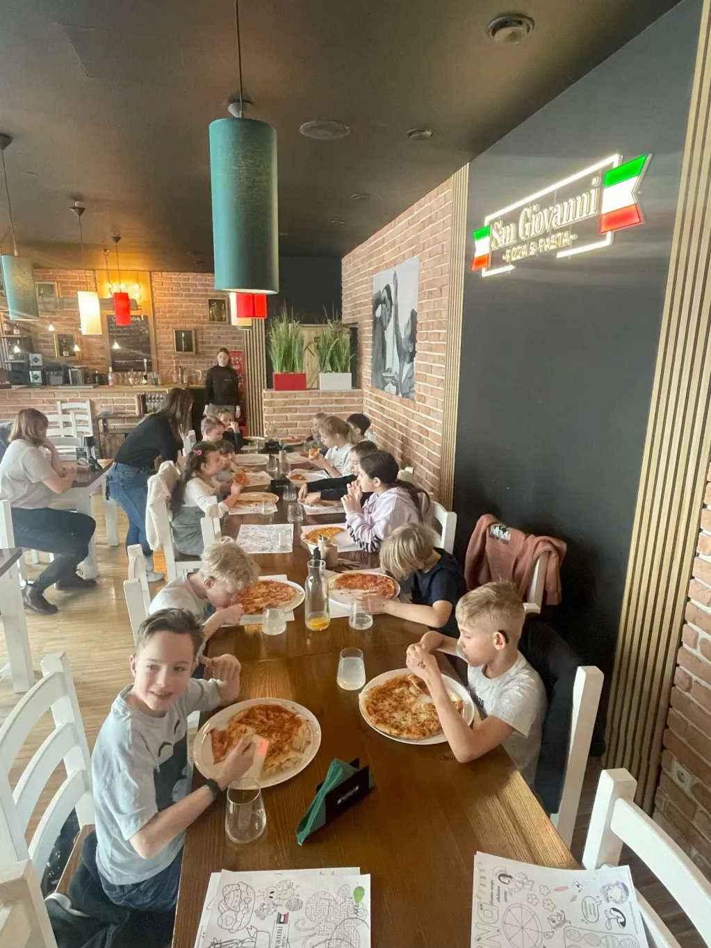Po upieczeniu pizzy każdy oddawał się prawdziwie włoskiej uczcie! Jedliśmy ze smakiem własnoręcznie przygotowane pizze i wymienialiśmy się doświadczeniami, która pizza jest najlepsza!