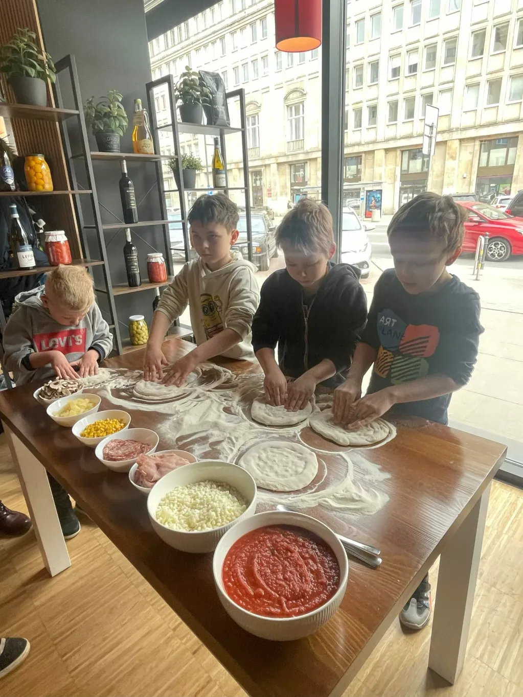 ulubionej pizzy. Następnie zaprosił nas do stołu i zademonstrował, jak utworzyć ciasto w kształcie kuli, aby móc wypuścić z niej powietrze, by na końcu uformować płaskie, okrągłe ciasto. Największe wrażenie zrobiło na wszystkich, gdy pan obracał ciastem wysoko w powietrzu.