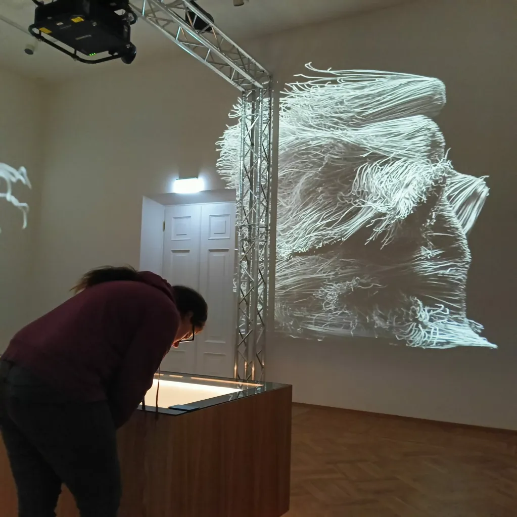 Wielkie wrażenie zrobiła na nas urna zawierająca pozostałości po rękopisach i starodrukach na tle multimedialnej instalacji pokazującej historię zniszczeń, gdy w czasie Powstania Warszawskiego trzy niemieckie samoloty zrzuciły bomby i zamieniły wspaniałą rezydencję w ruinę.