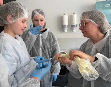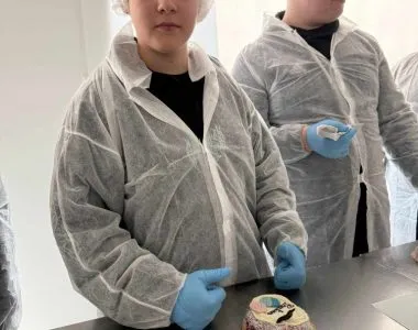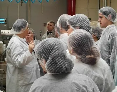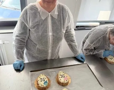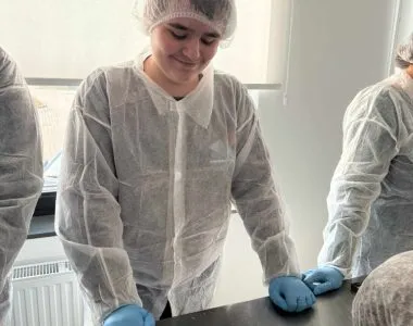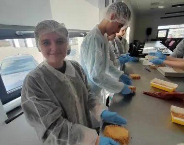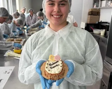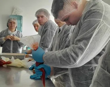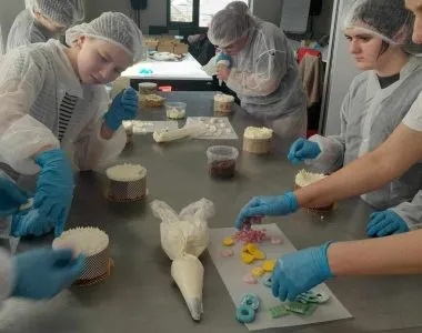 W czasie pierwszej części warsztatów uczniowie poznali proces przemysłowej produkcji ciast. Odbyli wycieczkę po całym zakładzie produkcyjnym, odkrywając krok po kroku tajemnice powstawania ciast od A do Z: od magazynu, przez maszyny, aż po pakowanie gotowych wypieków i wysyłania ich w świat. Największym hitem okazała się… drukarka do ciast! Tak, taka prawdziwa, tylko zamiast tuszu – barwniki spożywcze. Jak się okazało, ciasta to nie tylko miks składników, ale też prawdziwa sztuka.