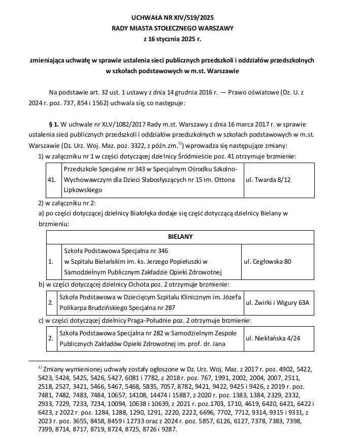 Informujemy, że Rada m.st. Warszawy 16 stycznia br. roku podjęła uchwałę zmieniają uchwałę w sprawie ustalenia sieci publicznych przedszkoli i oddziałów przedszkolnych w szkołach podstawowych w m.st. Warszawie.