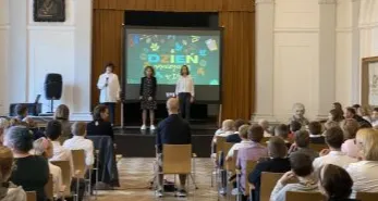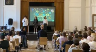 Uroczystość w auli rozpoczęła się od występów uczniów z klas czwartych i piątych. Wiersz, życzenia i piosenka w ich wykonaniu – oczywiście zarówno