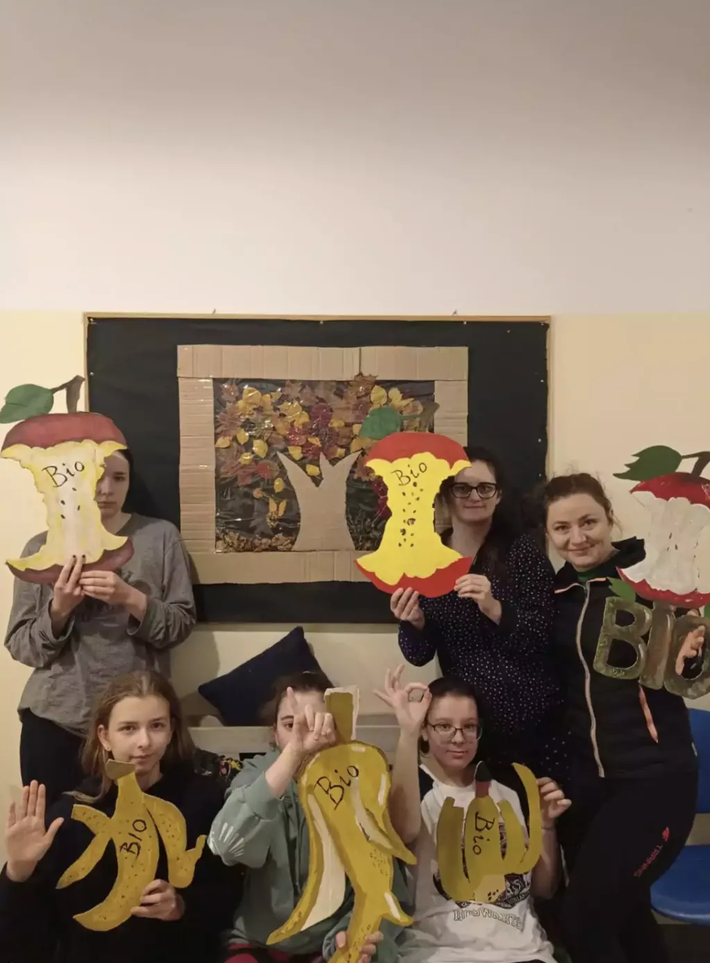 Wychowankowie starszych oraz młodszych grup brali udział w warsztatach na temat segregacji śmieci. Młodsi przygotowali plakaty i przykleili je na każdy odpowiedni kosz. Starsze wychowanki artystycznie ozdabiały resztki jedzenia, skórki od banana i inne bioodpady, a następnie oznaczyły odpowiednie kosze jako bio.
