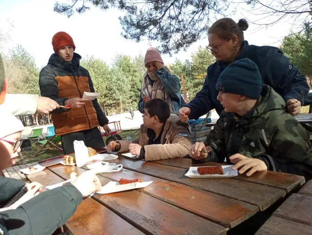 Tak zmęczeni i głodni zasiedliśmy w Strefie Piknikowej do pysznej kiełbaski prosto z grilla. Zjedliśmy jeszcze mufinkę popijaną ciepłym kakao. Wszystko smakowała wybornie!