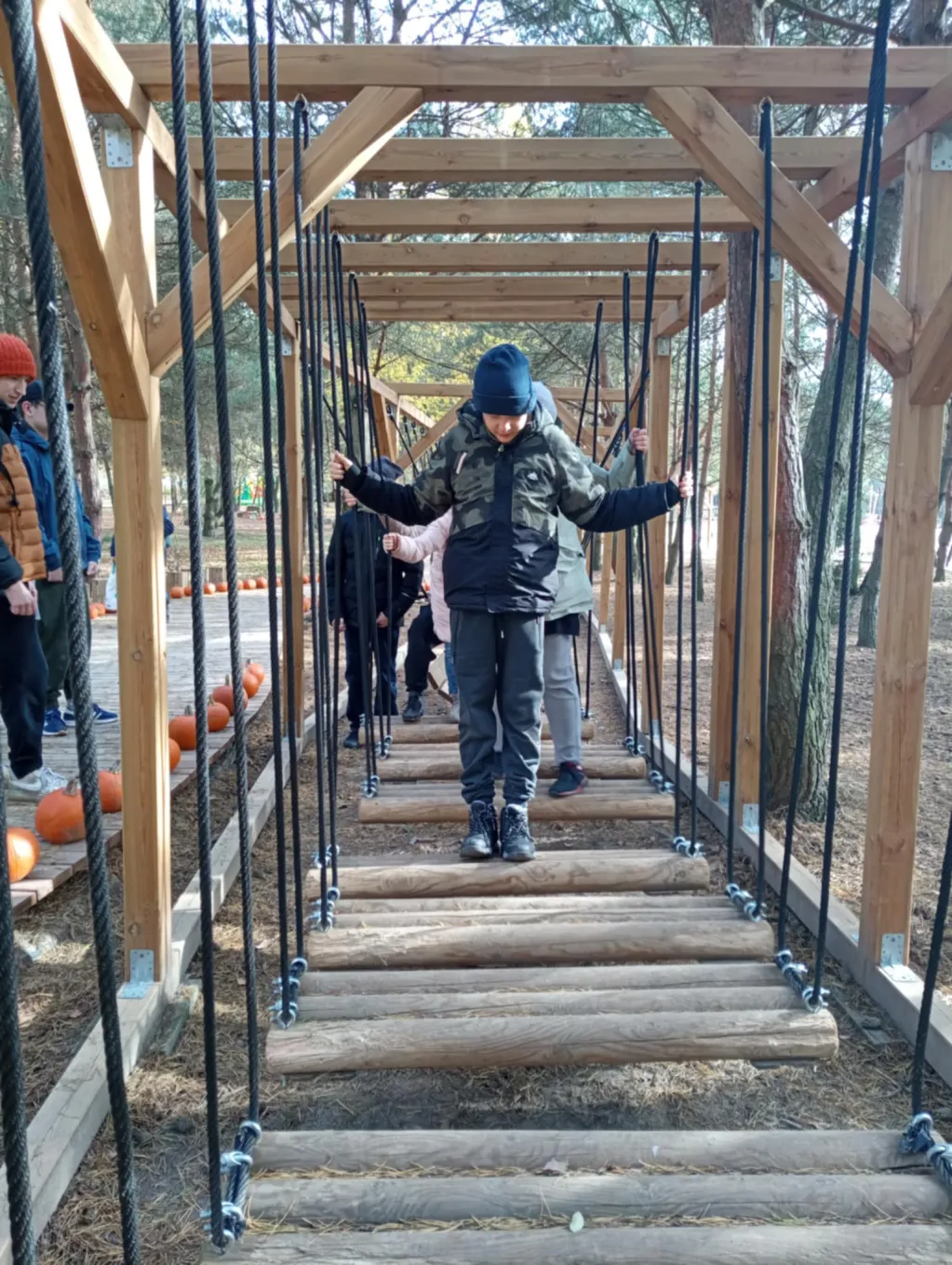 Po tej przygodzie czekała nas kolejna metamorfoza – zamieniliśmy się w krety i biegaliśmy krecimi tunelami na Kretowisku. Dalej czekało na nas pomieszanie zmysłów w Brzozowym Labiryncie. Na szczęście wszystkim udało się wyjść z niego cało i zdrowo. Już byliśmy zahartowani, więc gdy pan przewodnik zaprowadził nas do Strachowiska – miejsca pełnego pająków, kościotrupów i czarnych kotów, byliśmy nieustraszeni. Za to wspinaczka po ruchomych podestach to było wyzwanie! Tylko osoby i silnych nerwach i … ramionach dały sobie radę. Bo tych fizycznych zmaganiach znaleźliśmy się na Owocowym Boisku, aby rzucać do siebie ...arbuzami.